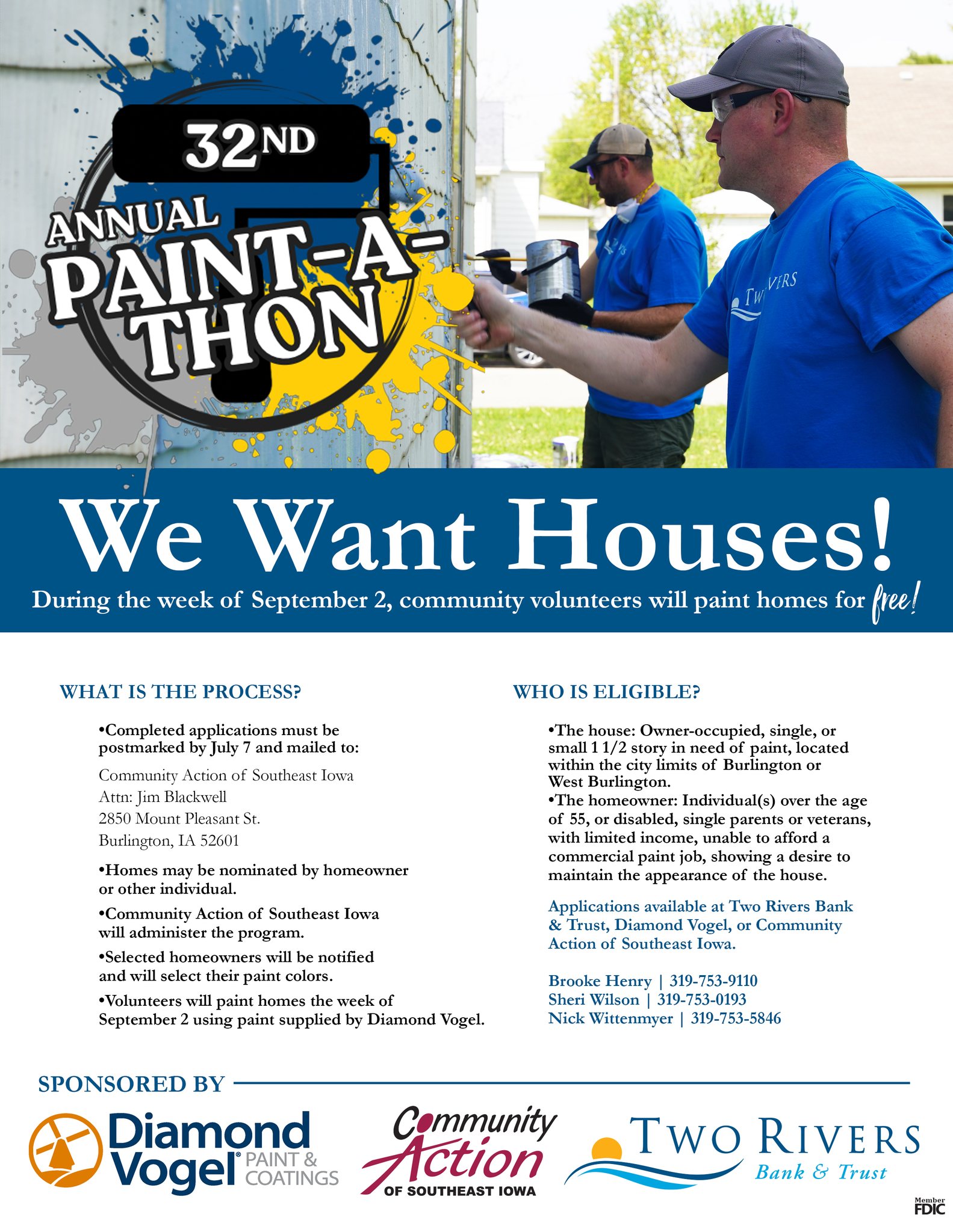 The Burlington Paint-A-Thon is a collaborative effort between Community Action of Southeast Iowa, Two Rivers Bank, Diamond Vogel Paint, and many area volunteers. The event started in 1993 and is held at the beginning of September each year, generally the week of Labor Day.