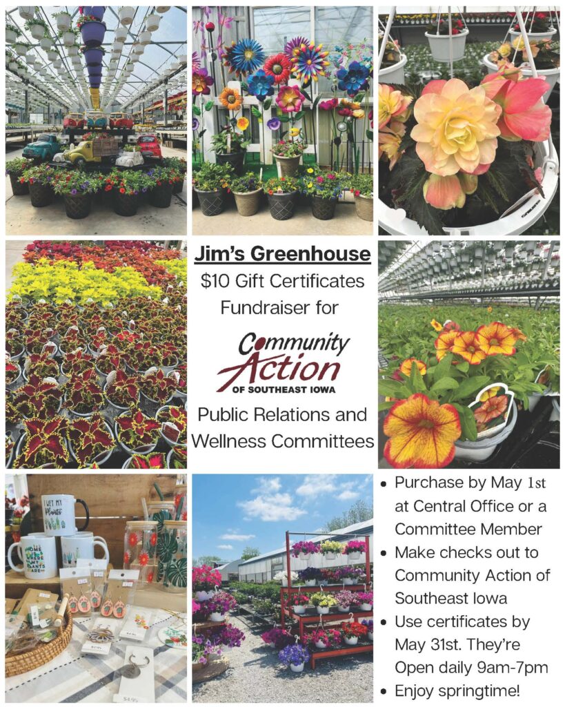 Purchase gift certificates at our Central Office (Burlington) or from a committee member. Certificate sales close on Friday, May 1st. Certificates can be used through May 31, 2026 on anything at Jim’s Greenhouse, 2407 280th St, Montrose, IA. They open for the season on April 1, 2026.