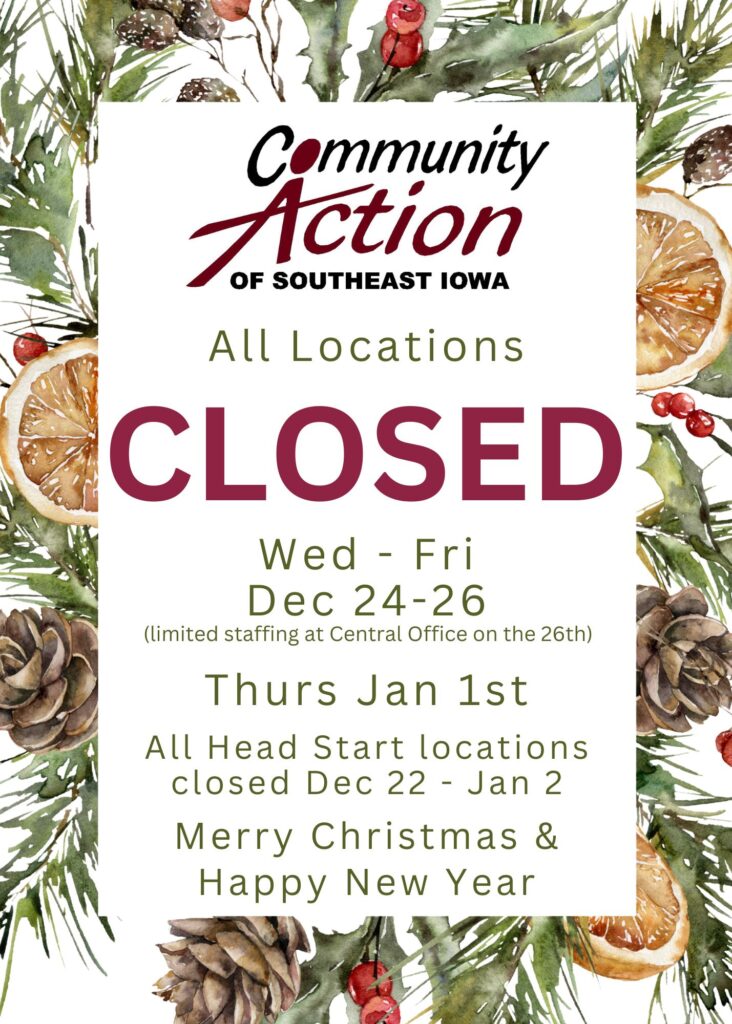 Head Start and Early Head Start will be closed for the holidays December 22, 2025 – January 2, 2026.