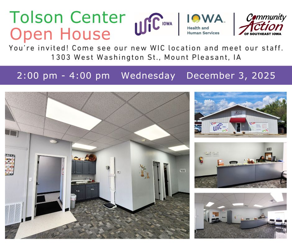The Supplemental Nutritional Program for Women, Infants, and Children (WIC) has changed locations in Mount Pleasant. Community Action of Southeast Iowa has had a center in Mount Pleasant since 1968. We have been in the Tolson Center at 1303 West Washington Street for decades. When Head Start moved out of the Tolson Center into their own building (Glenwood Head Start) in summer of 2024, WIC was able to secure funds for renovating one of their old classrooms into a clinic. We had our first clinic there in September 2025.