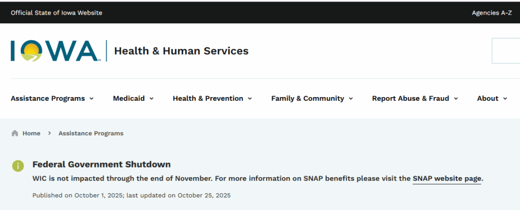 As of right now, there will be no disruption in WIC benefits for families in November! Please give our office a call at 319-209-2850 in Burlington or 563-283-6030 in Muscatine if you need to schedule an appointment or if you don’t have your November benefits issued.